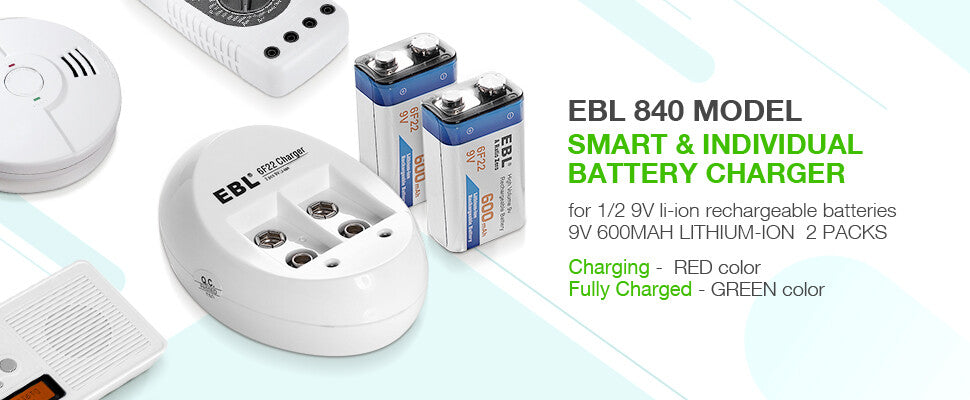 Compatibility: EBL 2 Bay 6F22 9V Charger - Charges 1-2pcs of 9V Li-ion, Ni-MH, or Ni-CD batteries at once.