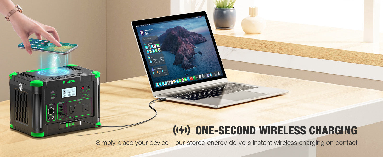 【Multiple Outputs Provide More Options】The solar generator can power up to 10 devices simultaneously according to your needs, equipped with 2*pure sine wave AC output ports (110V/500W), 3*USB-A QC3.0 ports (18W max), 1*USB-C PD output (20V/3A, 60W max), 2*DC ports (12V/5A), 1*Car Port (12V/10A) and 1*wireless charger(9V/1.1A,10W). Quick Charge USB 3.0 and USB-C PD output allow for charging 2.5x faster than a universal USB-C charger.