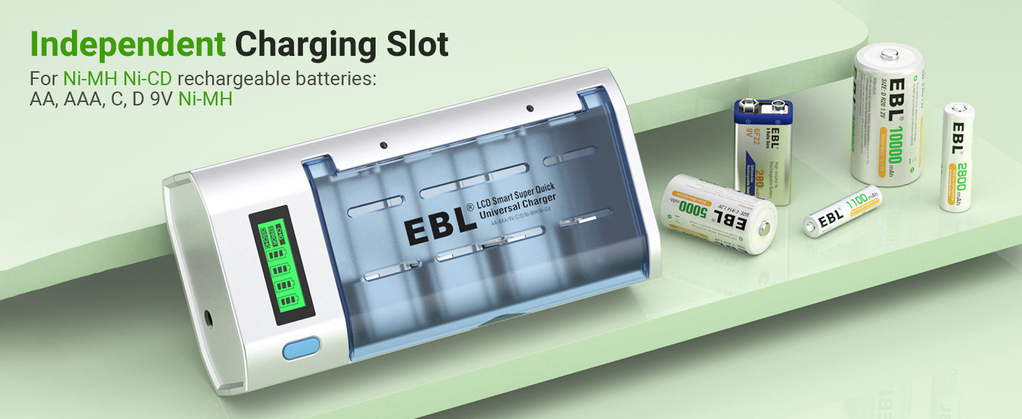Compatibility: With independent charging slots, the EBL 906 smart charger can charge a variety of AA, AAA, C, D, and 9V Ni-MH/Ni-CD batteries.
